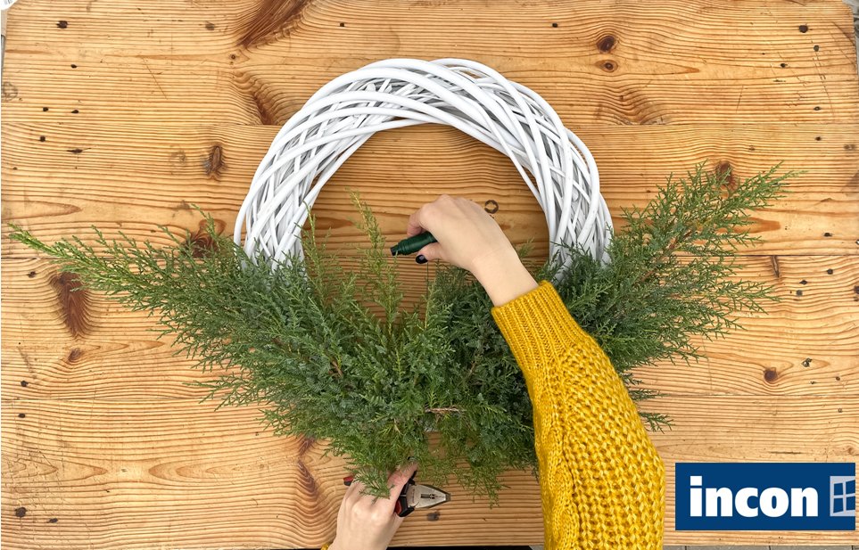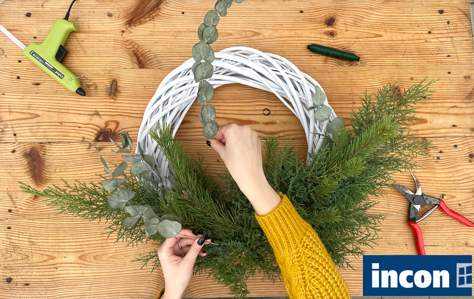 3. Aby sme celkový vzhľad venca oživili aj niečím iným ako čečinou, pridáme medzi vetvičky pár kúskov eukalyptu najlepšie tak, aby kopíroval tvar venca.
