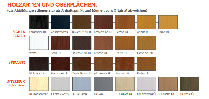 Die lange Haltbarkeit der Holzprodukte wird durch die hochwertige dreistufige Oberflächenbehandlung unterschtützt (Farbensystem Teknos).